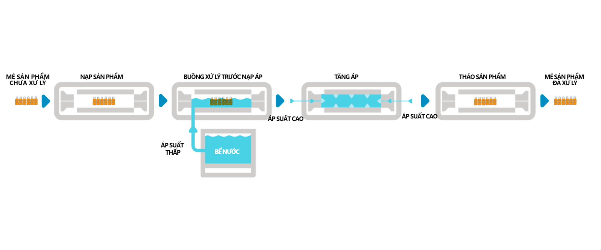 Công nghệ này được tiến hành bằng cách sử dụng áp suất đẳng tĩnh ở mức rất cao, lên tới 6,000 bar /600MPa /87,000 psi, truyền qua môi trường truyền áp là nước và giữ trong vài phút. Áp suất này được truyền và tác động đồng đều, tức thì lên toàn bộ khối sản phẩm, vì vậy đạt được hiệu ứng tương đương với quy trình tiệt trùng, chỉ khác là không sử dụng nhiệt.